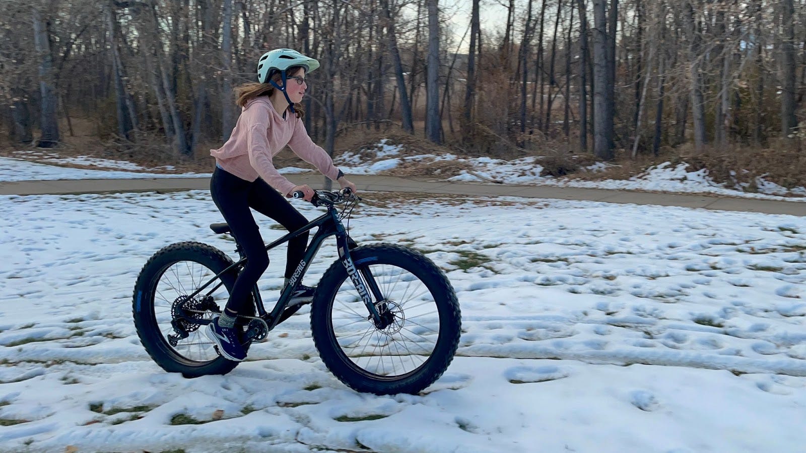 John: On snow, the Flume performs incredibly well, with the wide tires providing good flotation and traction. The rigid carbon fork helps to smooth out the ride and improve control on slippery surfaces. I personally prefer having a rigid fork as opposed to front suspension, because I like feeling the snowy terrain underneath. Not to mention, the fat tires do an outstanding job of dampening any moderate bumps and offering some compliance to the ground. Despite the appearance with its huge tires, the Flume is really agile and nimble, making it a good choice for winter riding and dry trails. Here in the Front Range of Colorado, the mix of terrain and conditions is a perfect setting to test the versatility of any mountain bike, especially a fat bike. I was able to take the Flume on dry dirt, rutty dried out mud, fresh packed snow, and melted out frozen snow. To be frank, the bike handles all of those conditions really well. It floats atop the unstable terrain like snow and loose dirt and yet can dig into mud or wet snow. I would be remiss to mention that I really enjoyed how it rides on flat hardpack dirt or road – It goes a lot faster than I would have guessed. I think one reason is that Borealis designed the bike to have a standard cross country mountain bike frame geometry. I love climbing and I found the compact geometry generates a stiff push off on the incline. It felt really familiar to ride and I didn’t require any acclimation. In fact, I think the Flume would be an excellent entry level mountain bike for any aspiring rider, since it offers the same comfortable fit and a lot more traction and stability. The short stem and wide handlebars help with handling and confident riding.