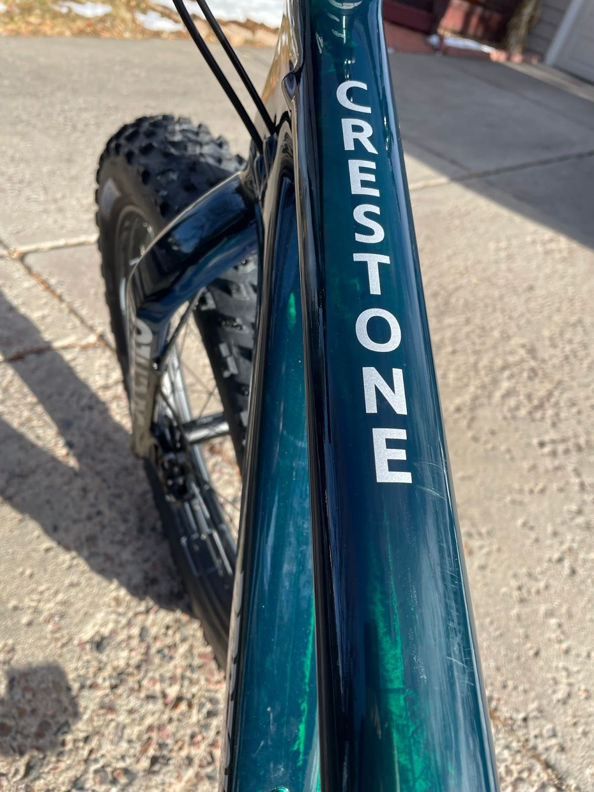Jeff: Right off the bat I was in awe of the Borealis Crestone. One quick lift of the bike, I was amazed at how light it feels, at just 26 lbs for a size medium, fat tired bike, I could hardly believe it. The green colored carbon fiber Crestone frame has a deep and textured look to it, sparkling in the sun and changing almost as if magic in different lighting conditions and sun angles. The construction, design, geometry and angles of the frame and fork make it clear that the folks at Crestone really know what they are doing and have not only supreme frame building skills, but have a keen sense of blending high performance and practicality. The bike is a work of art.
