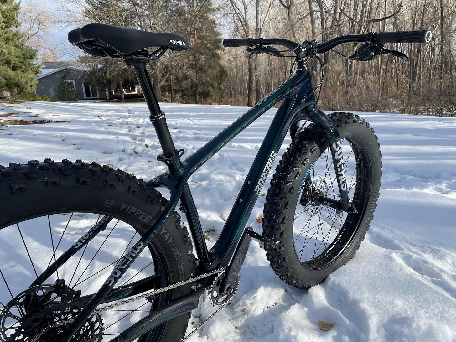 John: Overall, I was very impressed with the Borealis Flume Fat Bike. The bike is well-made and durable, and it is super stable while riding on snow, loose dirt, and other challenging terrain. It has a comfortable and secure feeling ride thanks to its low center of gravity and slack head tube angle. The rigid carbon fork provides sufficient shock absorption and control, making the bike feel planted and confident on rough trails. The drivetrain is smooth and reliable, with a 1x12 wide range of gears for climbing and descending. The hydraulic disc brakes offer excellent stopping power in all conditions, and the tires provide good traction, grip, and dampening of harsh terrain.