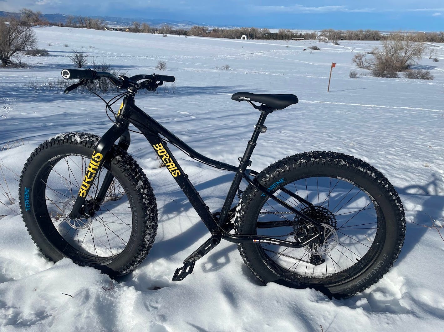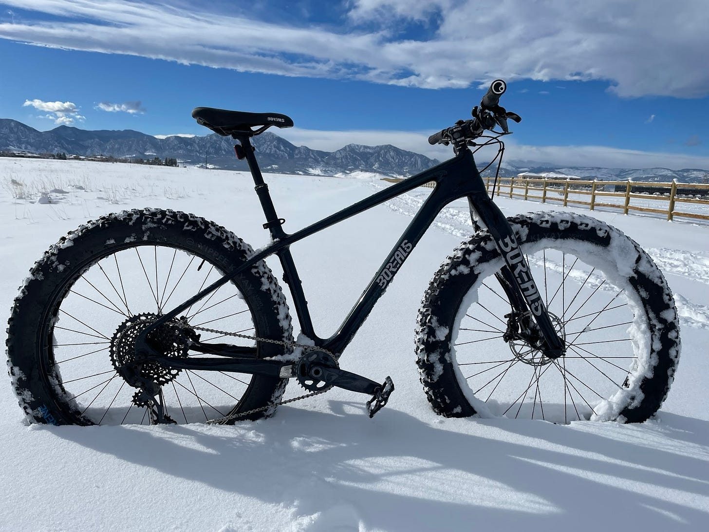 They are truly top of the line in fat bikes. The Crestone model is their carbon frame bike and is as good as it gets, while the Flume is the aluminum version retaining nearly the same geometry and is a capable beast of a bike as well. Jeff V tested the Crestone while John tested the Flume. Both bikes were spec’d with high quality components and ready to ride upon delivery. Speaking of delivery, Borealis is a true family business with our bikes being hand delivered by Steve’s son who traveled from Colorado Springs to the Boulder area with a trunk full of fat bikes and delivered them directly.