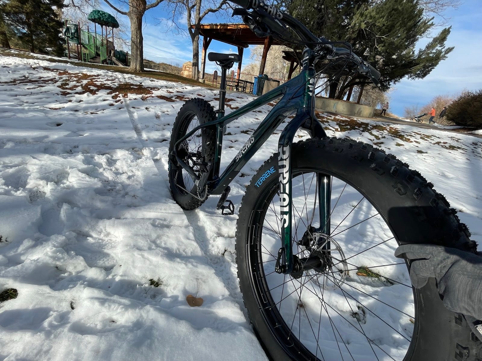 The tires are Terrene YKY 27.5 x 4.3 Yipee Ki Yay, which offer excellent flotation and traction on loose surfaces, yet roll surprisingly well on hard surfaces.