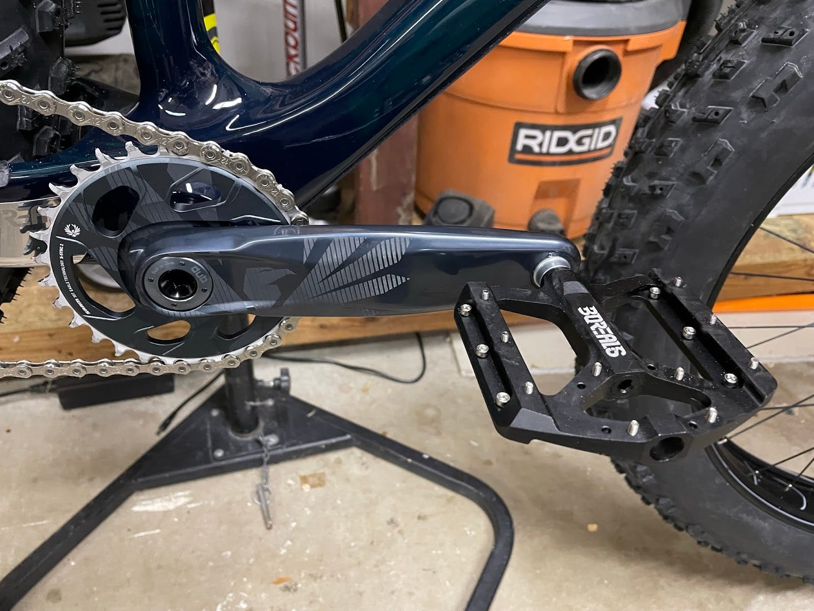 Up front on the Crestone we have a SRAM Eagle DUB GX crankset made of forged aluminum, which is light and stiff, coupled with a SRAM DUB bottom bracket that gives no flex. The Q factor is quite wide here, but was not particularly noticeable. The Borealis platform pedals are broad with a secure grip.