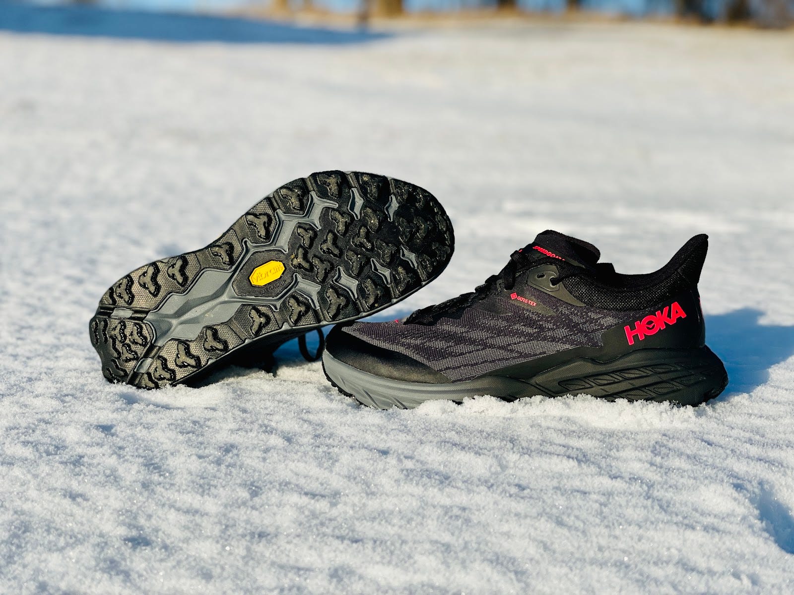 John: The Speedgoat 5 GTX is a great fitting shoe that has an extremely waterproof + secure upper. It boasts a well cushioned (but not pillowy) midsole with a smooth rockered ride. It is a fun, reliable and stable shoe that opens greater possibilities of exploring in harsh conditions thanks to the GoreTex upper. The Speedgoat 5 is versatile and is a great option for moderately paced runs, short and long distance across a multiplicity of terrain types