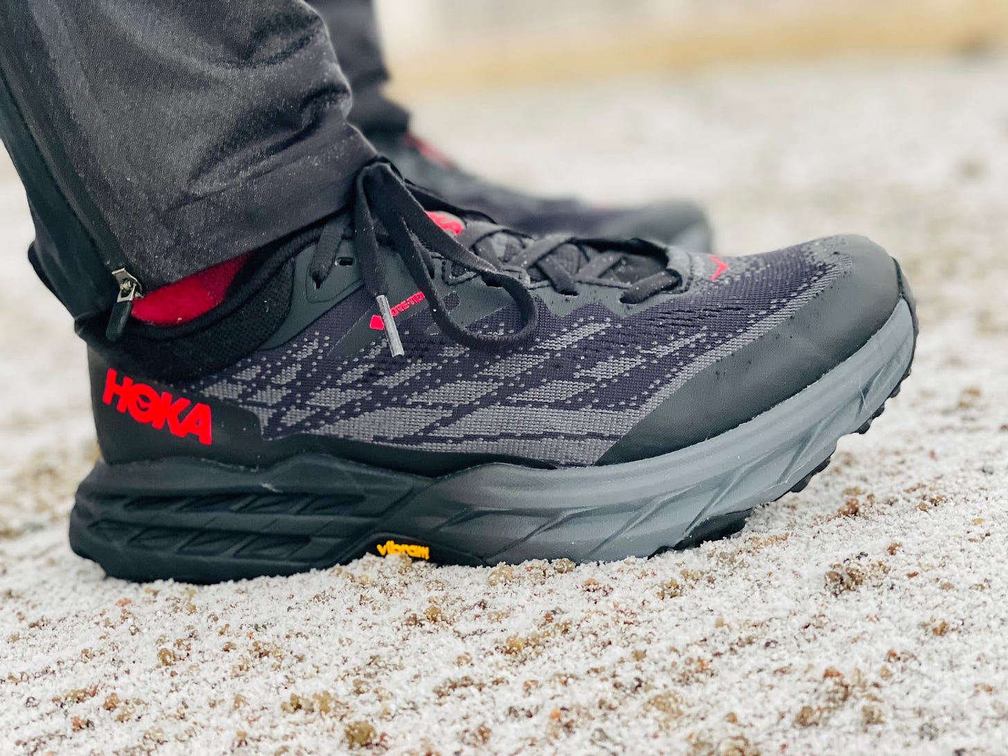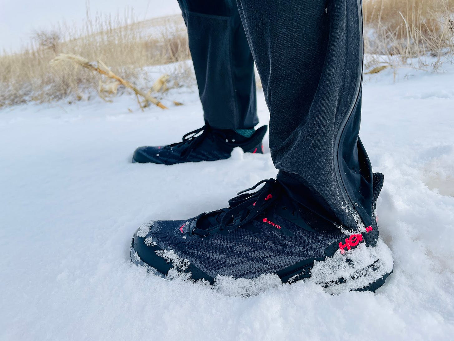 I’d prefer a traditional heel style and I’m hoping Hoka ditches the “elf heel” for this shoe in the next version. The heel security is okay, but the shoe would ride much better for me on uneven terrain if the heel fit was lower and tighter around my ankle. Without a gaiter, the elf heel can be a funnel for snow.