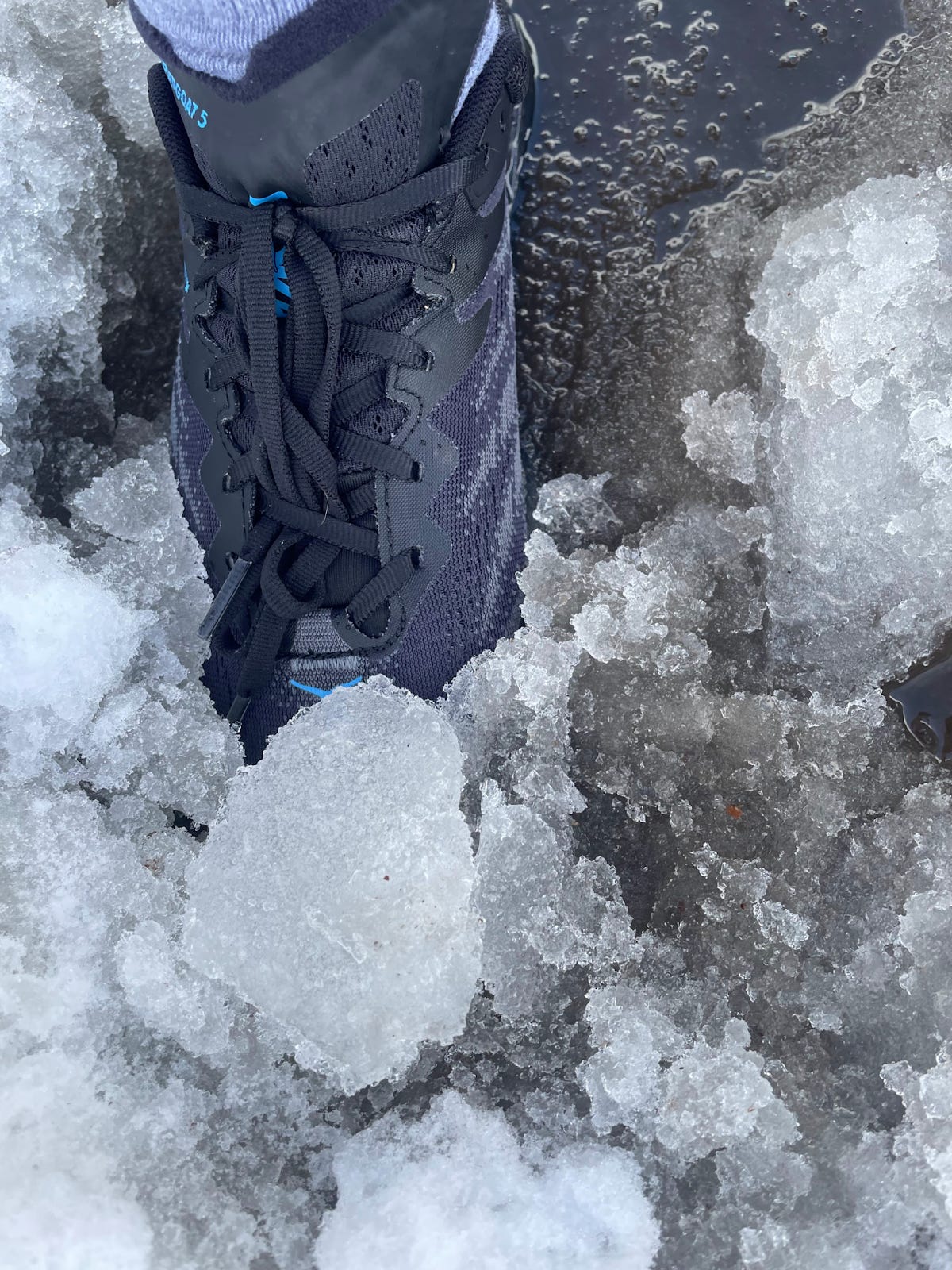 Renee: For winter running, the SG 5 GTX is very useful. I don’t like heavy shoes and I’m not usually a fan of rocker midsoles. However, the GTX of the upper is well integrated around the entire tongue, so during winter snow/slush/sleet running I had no issues racking up miles in this shoe for review.