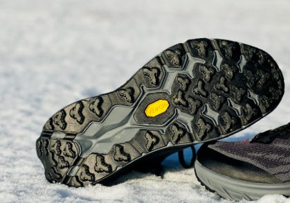 At times, the lugs seem less than 5mm, but it’s hard to get good traction through snow regardless of outsole quality. Hoka’s “Traction Lugs” refer to the small, rubber triangular shapes that outline the front and back of most of the outsole lugs.
