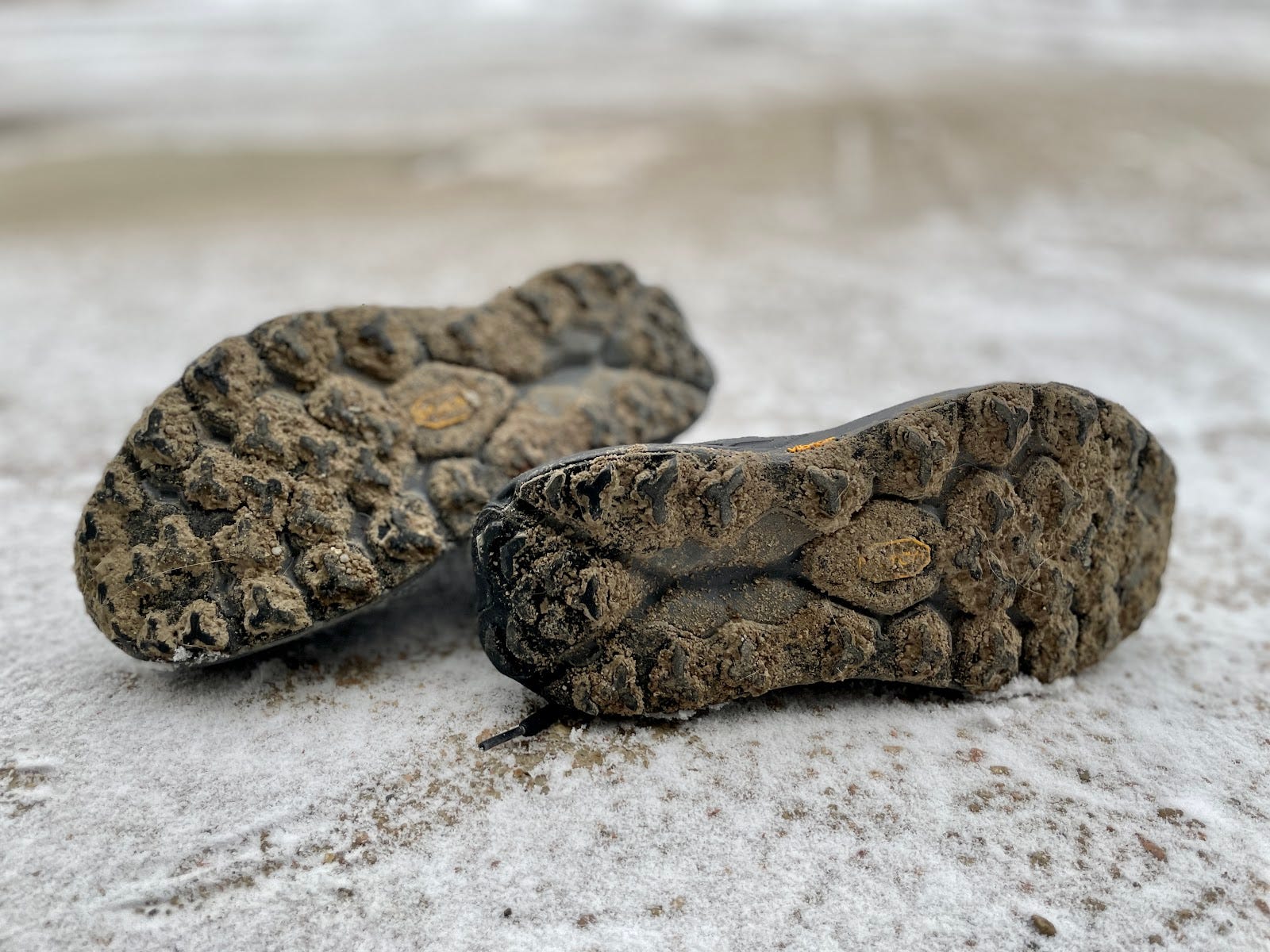 The 5mm lugs and Vibram MegaGrip are comfortable on a variety of terrain. I ran through snow (mostly), some mud, gravel, grass, and through fields. The 5mm lugs aren’t uncomfortable on rolling hills (gravel roads) and offer enough traction through slight mud.