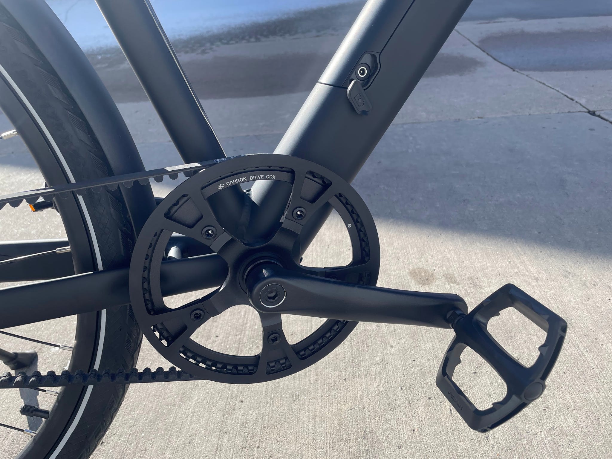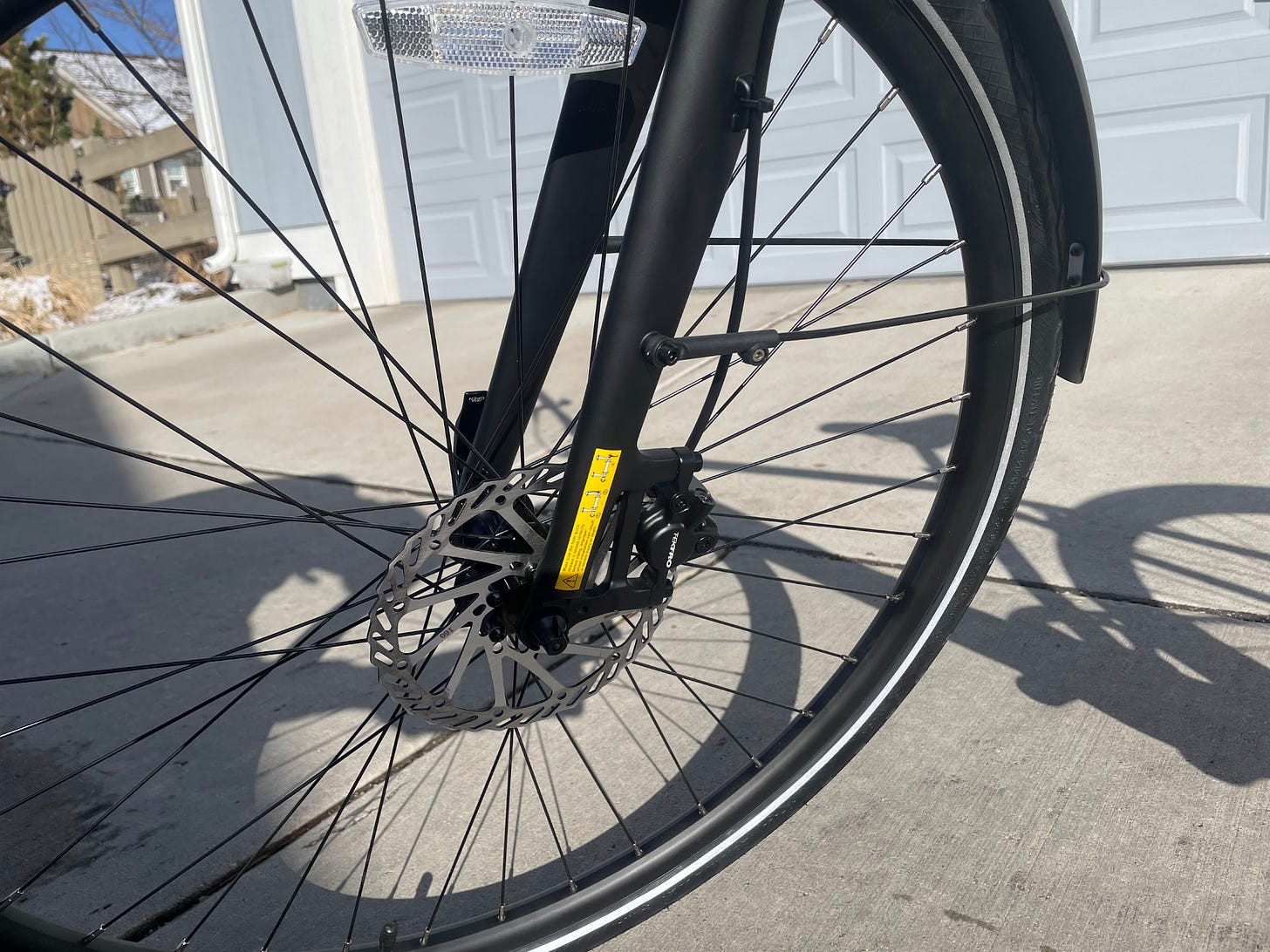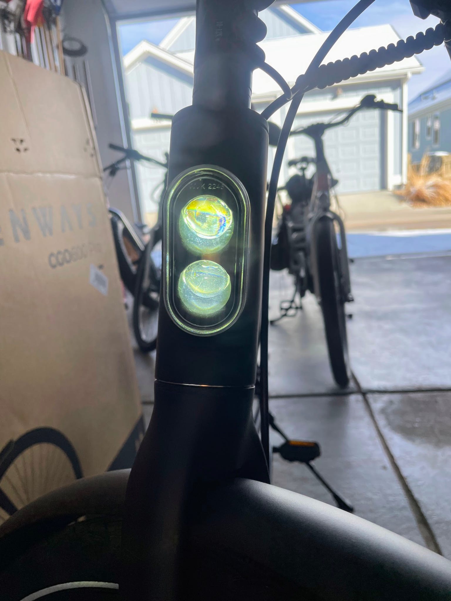 At 37 pounds, the CGO600 Pro is one of the lightest eBike on the market. This makes it easy to maneuver and sling over your shoulder to put into storage, and it also makes it a good choice for riders who are looking for an eBike that's fairly easy to ride up hills. The CGO600 Pro has a front and rear hydraulic disc brake system. This provides awesome stopping power in all weather conditions. I’m a big fan of equipping eBikes with hydraulic disc brakes for ultimate stopping power. The bike also has a single speed hub, which is super easy to maintain and provides a smooth and efficient ride. One feature that I love are the integrated lights, which makes it safe to ride at night. The front light is moderately bright and provides decent visibility, while the rear light is visible from all angles. The lights are powered by the bike's battery and turn on automatically when you start riding. I only wish the front light were brighter so it was easier to see in areas without street lamps at night.
