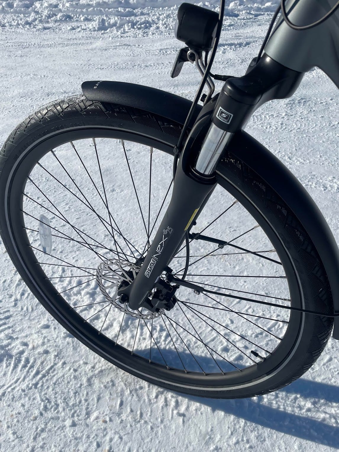 I really appreciate the SR SUNTOUR Suspension Front Fork that does an excellent job of muting road bumps especially at higher speeds.